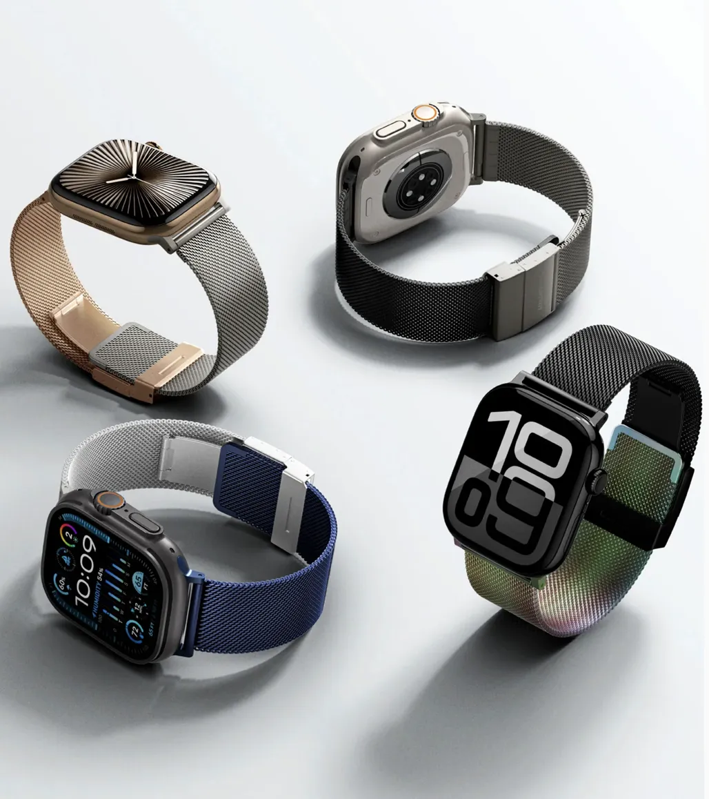 Металлические браслеты вроде Milanese Loop или классические звенья – выбор для тех, кто хочет долговечности и эффектного вида. Они выглядят солидно и подходят как для работы, так и вечернего выхода.Плюсы: